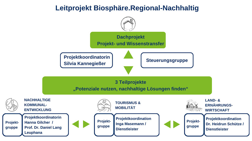Im Kern geht es darum, der Politik und der Verwaltung gute Ideen für nachhaltiges Handeln aufzuzeigen. 17 Kommunen der Biosphärenregionen aus den vier Landkreisen Ludwigslust-Parchim, Lüchow-Dannenberg, Lüneburg und Nordwestmecklenburg erhalten Unterstützung, um ihre Kommunen langfristig ökologisch, sozial und wirtschaftlich zukunftsfähig zu machen. Dazu erarbeiten Projektmanagement, Studierende der Nachhaltigkeitswissenschaften der Leuphana-Universität und Kommunen Ideen, die konkrete Projekte und Förderansätze zum Ziel haben. Schwerpunktthemen sind die nachhaltige Energieversorgung, Ortskernentwicklung und Bioökonomie. Ergebnisse können die Erprobung neuer Technologien oder digitaler Anwendungen, bauliche Maßnahmen oder die Gründung gemeinnütziger Institutionen sein.