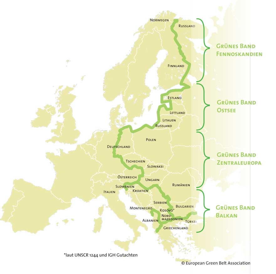Was damals in Deutschland begonnen hat, ist heute ein gutes Beispiel internationaler Zusammenarbeit: Da sich der damalige „eiserne Vorhang“ über ganz Europa erstreckt, gibt es auch in zahlreichen anderen Ländern beeindruckende und gleichzeitig schützenswerte Gebiete und Landschaften, die im Vergleich nicht unterschiedlicher und vielfältiger sein könnten. Über eine Länge von 12.500 Kilometern verläuft das Europäische Grüne Band - von der Nordspitze Norwegens bis in die Türkei. Ausgehend von dem deutschen Projekt, haben im Jahr 2003 24 Länder in Zusammenarbeit die „Initiative Grünes Band Europa“ ins Leben gerufen. 2014 folgte dann, unter anderem federführend durch den BUND, die Gründung der „European Green Belt Association“.