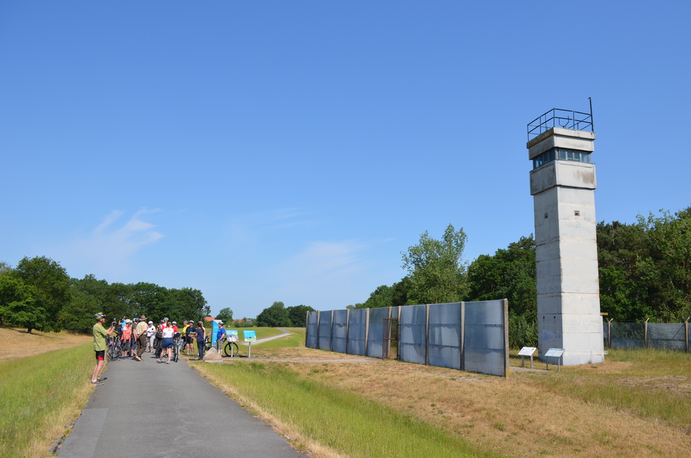 Auf dem Hof Konau 11 wurden sie von Siegrun Hogelücht vom Archezentrum Amt Neuhaus, Anne Spiegel von der Biosphärenreservatsverwaltung Niedersächsische Elbtalaue und Ranger Ingo Valentin aus dem Biosphärenreservat Flusslandschaft Elbe – Mecklenburg-Vorpommern begrüßt und in das Biosphärenreservat eingeführt. Nach einem kleinen Rundgang durch das Archezentrum ging es zum alten Grenzturm in Konau, wo es neben Grenzgeschichten auch Infos zum Thema „Grünes Band“ gab. Ein Teilnehmer erzählte, dass er zu Grenzzeiten an der Grenze bei Konau seinen Wehrdienst abgeleistet hatte und zeigte auf die inzwischen verlassene ehemalige Unterkunft der Soldaten in Haar. Die Teilnehmenden kamen aus dem Lüneburger Raum, Neustadt-Glewe bei Ludwigslust und weiteren Orten in dieser Umgebung. Die Zeit vor der Grenzöffnung hatten sie sehr unterschiedlich erlebt und konnten sich hierzu während der Radtour austauschen.
