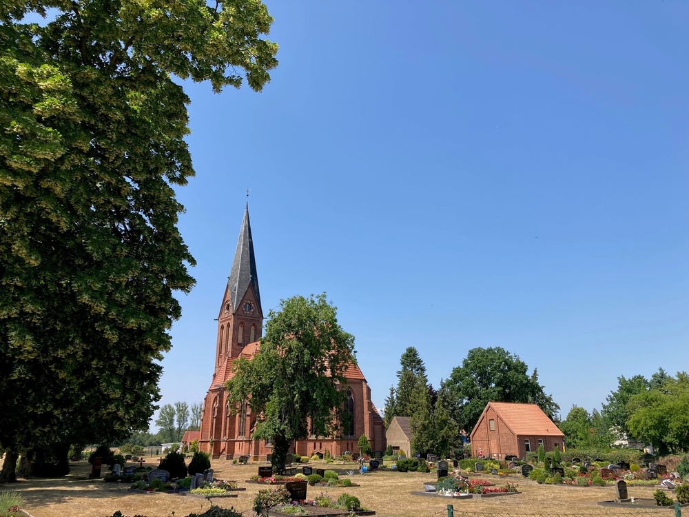 Über Neuhaus und Dellien führte die Tour zu den „Auerochsen“ (Heckrindern) und Wildpferden (Koniks) bei Preten. Sabine Niederhoff vom Archebetrieb Niederhoff kam zur Weide und erzählte etwas zu ihren Tieren. Es waren fast 30 Grad und alle benötigten eine Pause. Dies war bei der Kirche in Blücher möglich. Wer Lust hatte, konnte den Kirchturm besteigen oder sich einfach in den Schatten legen und etwas essen. Neben der Kirche wurde ein Spielplatz eingeweiht und die Radfahrer*innen wurden von den Dorfbewohnern ganz herzlich begrüßt und durften an ihrem Grill-Picknick teilhaben. Es kam zu interessanten Gesprächen.