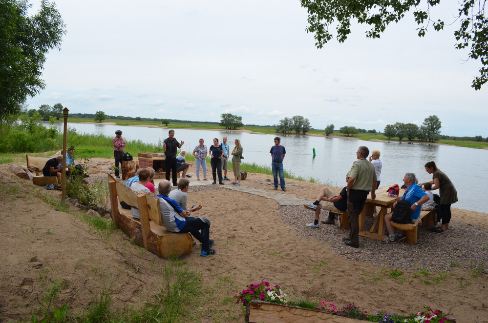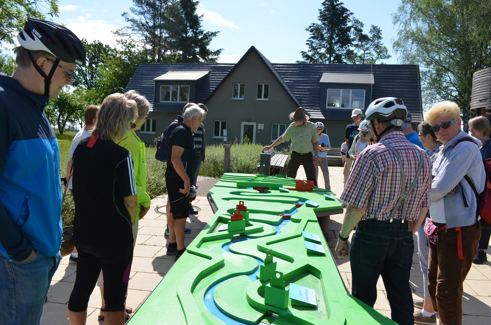 Um 10:00 Uhr wurden die Teilnehmenden von Ranger Ingo Valentin aus dem Biosphärenreservat Schaalsee-Elbe, der Natur- und Landschaftsführerin Siegrun Hogelücht von der Tourist-Info-Amt Neuhaus und Anne Spiegel von der Biosphärenreservatsverwaltung Niedersächsische Elbtalaue am „Elwkieker“ in Boizenburg begrüßt. Nach einer kurzen Einführung zur Elbe im Allgemeinen und Fischen im Speziellen durch Siegrun Hogelücht, führte Ingo Valentin die Elbradler durch die interessante Biosphären-Draußen-Ausstellung. Radelnd Richtung Lauenburger Brücke wurde am ehemaligen Grenzübergang von Ost- zu Westdeutschland Halt gemacht. Hier berichtete Ingo Valentin von seiner Tätigkeit als Ranger.