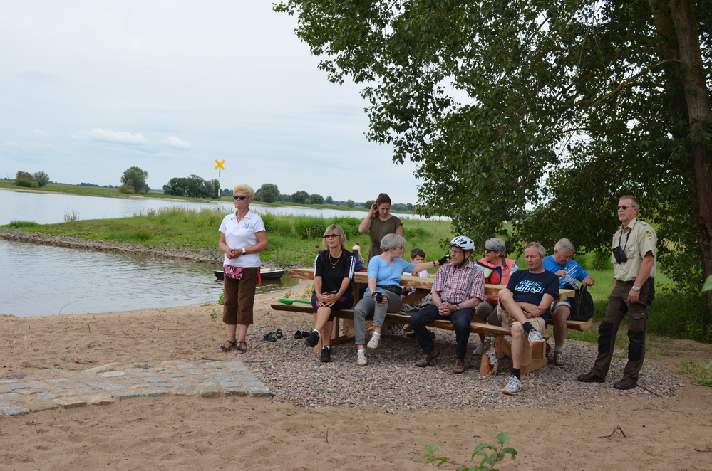 Spontan wurden die Radelnden in Radegast von dem am Elbradweg wohnenden Leiter des Biosphärenreservats Niedersächsische Elbtalaue, Johannes Prüter, begrüßt. Bei einer kurzen Rast am kürzlich von der Landjugend eingerichteten Grillplatz am Elbestrand berichtete Johannes Prüter aus der Arbeit der Biosphärenreservatsverwaltung. Wieder auf dem Elbdeich folgten weitere Infos zur geplanten Deichrückverlegung bei der Vitico und zur Schäferei am Heisterbusch.
