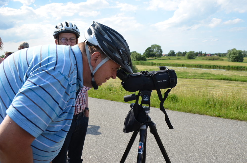 In Bleckede fand die langersehnt und verdiente Pause statt, ehe es mit der Elbfähre über die Teldau zurück nach Boizenburg ging. An der Fähre wies Siegrun Hogelücht auf die Besonderheiten der Obstbaumalleen im Amt Neuhaus und das „Grüne Band“ hin. Der Höhepunkt auf dem letzten Abschnitt, war ein Seeadlernest in der Aue. Ranger Ingo Valentin hatte ein Spektiv besorgt, so dass ein Seeadler mit Jungen bildfüllend beobachtet werden konnte. Auf den letzten Kilometern der insgesamt 55 Kilometer goss es wie aus Kübeln. Alle wurden pitschnass, kamen aber zufrieden am Endpunkt an.