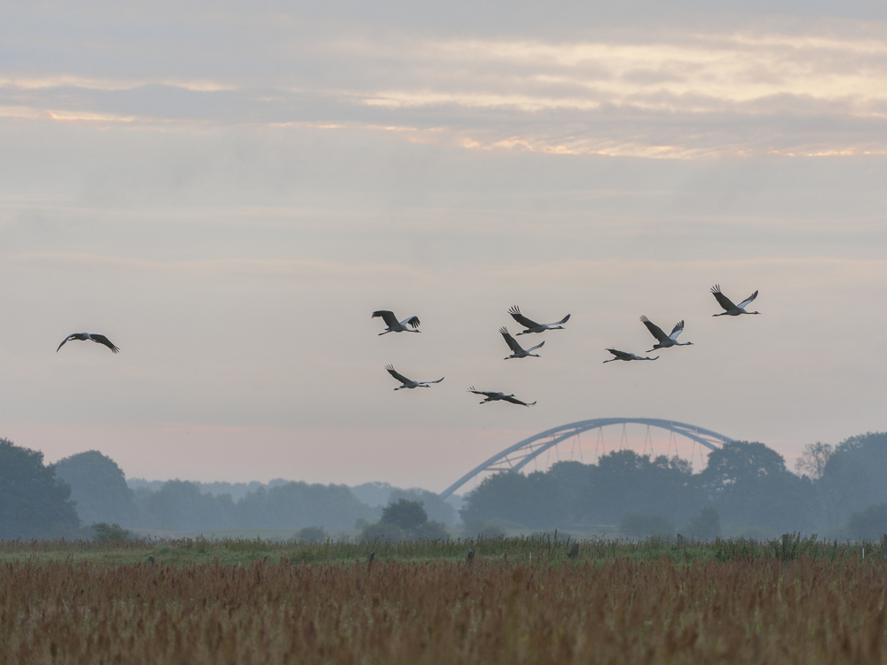 Auf den abgeernteten Feldern der Elbmarschen treffen Anfang Oktober die ersten Saatgänse (Anser fabalis) ein. Auch Kranichtrupps (Grus grus) halten sich nun zeitweise in der Elbtalaue auf. Sie bevorzugen abgeerntete Maisäcker. Zum Schlafen fliegen sie in die Flachwasserbereiche der Buhnenfelder und Sandbänke an der Elbe oder suchen ausgedehnte Nasswiesen auf.