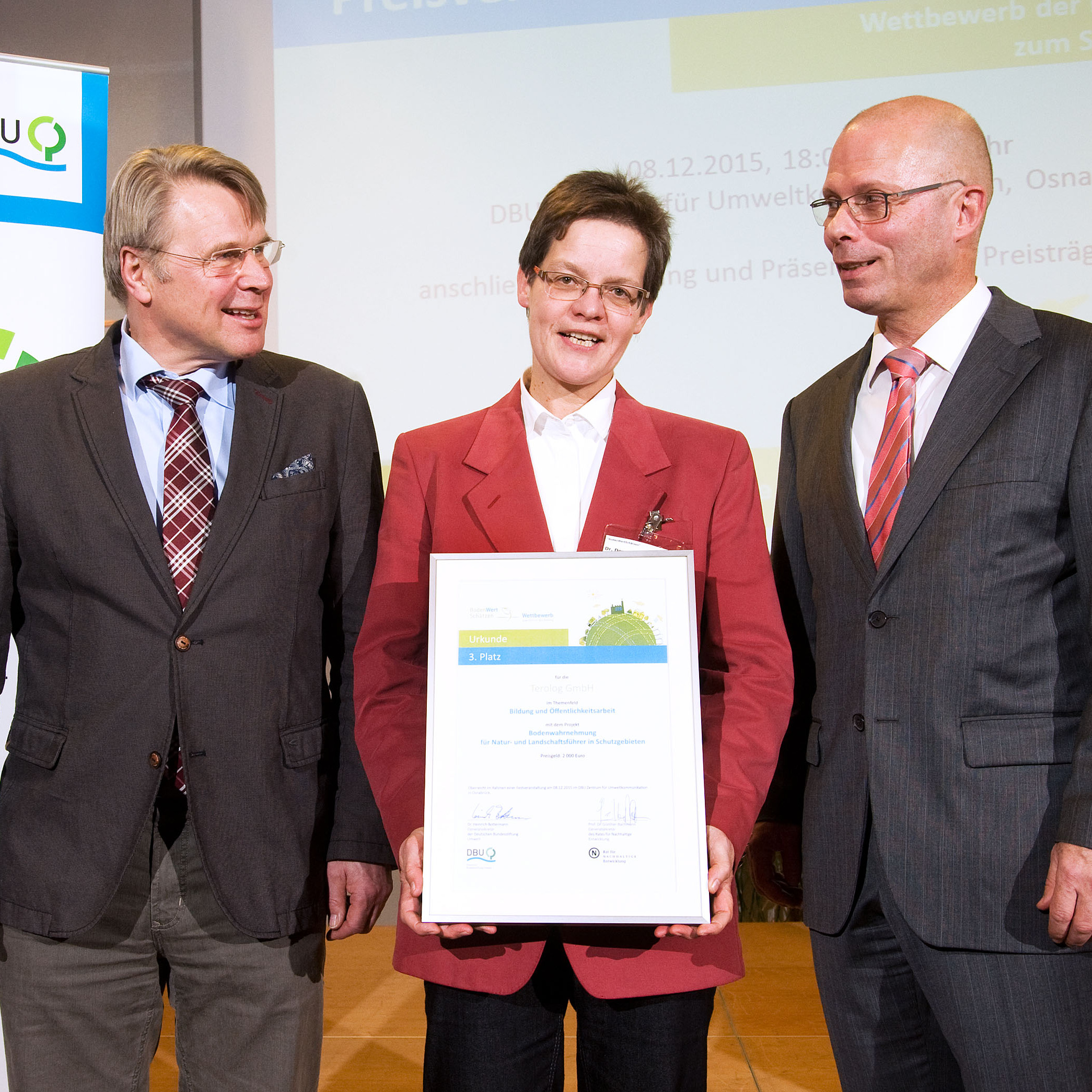 Dr. Dorothe Lütkemöller bei der Preisverleihung mit dem Generalsekretär der Deutschen Bundesstiftung Umwelt, Dr. Heinrich Bottermann (links) und dem Generalsekretär des Deutschen Nachhaltigkeitsrates Prof. Dr. Günther Bachmann (rechts).