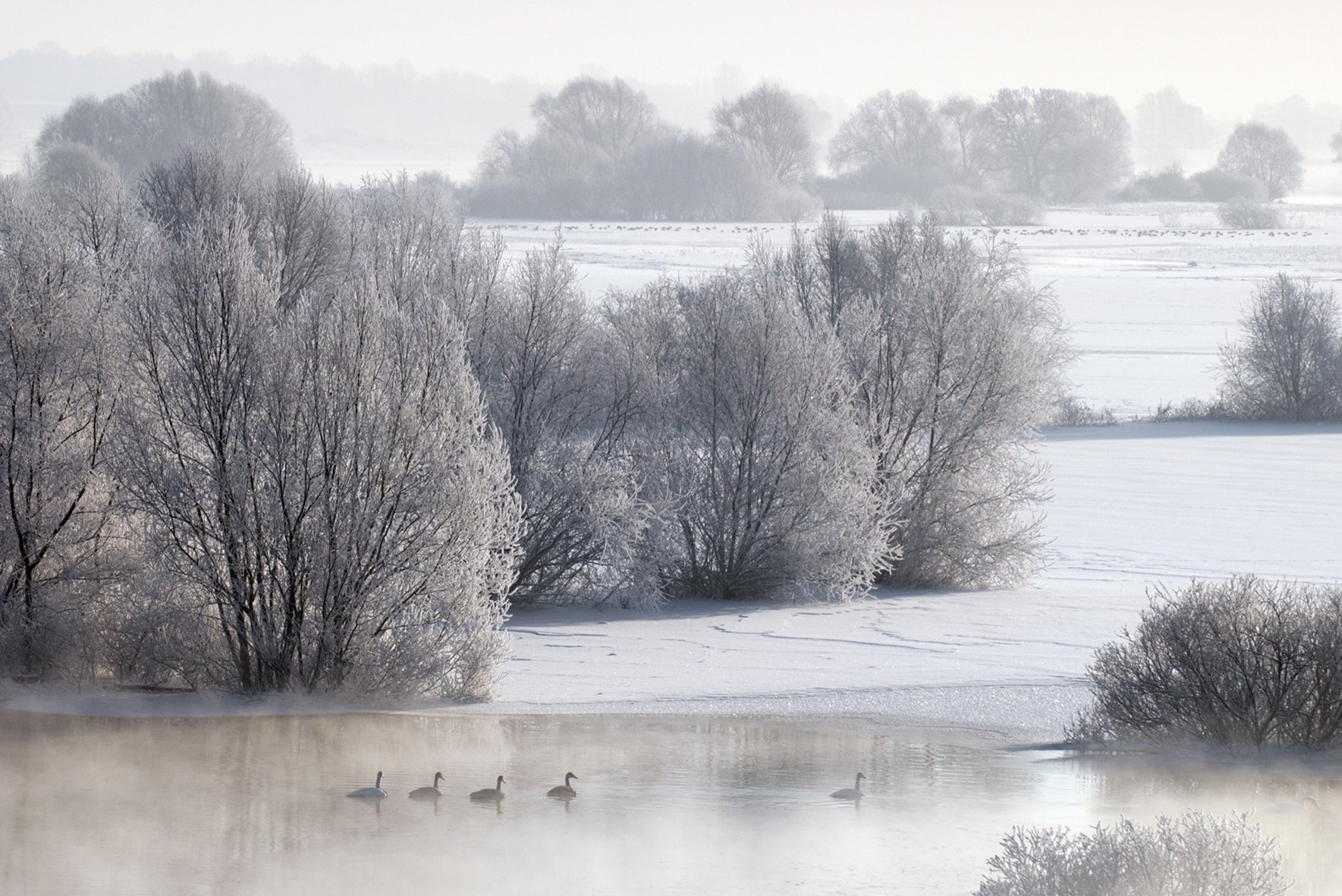 Pfannkucheneis, das wunderschöne Muster auf die Elbe zaubert, ein Graureiher, der mit seinem aufgeplusterten Gefieder aussieht, als trage er einen schicken Wintermantel und unzählige elegante Singschwäne sind nur einige der großformatigen Motive.