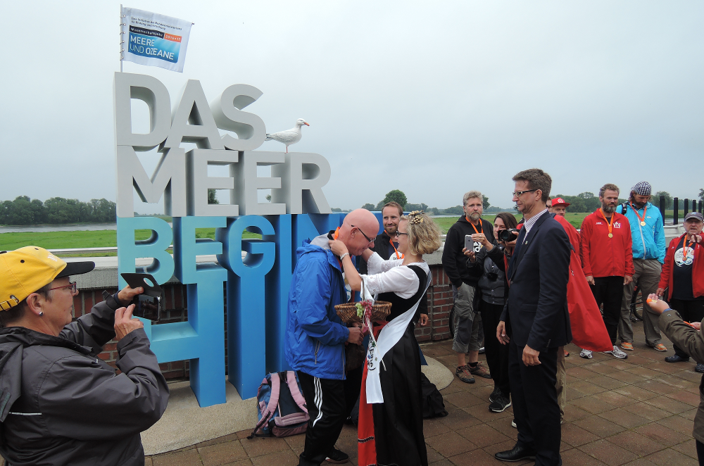 Gegen 18:45 Uhr erreichten die Schwimmer in Topform und gut gelaunt den Hafen von Hitzacker. Von Bürgermeister Holger Mertins, der aktuellen Hitzackeraner Weinkönigin, Tanja Basedow, sowie den Teams der Biosphärenreservate und der Elbschwimmstaffel wurden sie in Empfang genommen. In Anerkennung ihrer großartigen Leistung verlieh Bürgermeister Mertins jedem Schwimmer eine Goldmedaille.