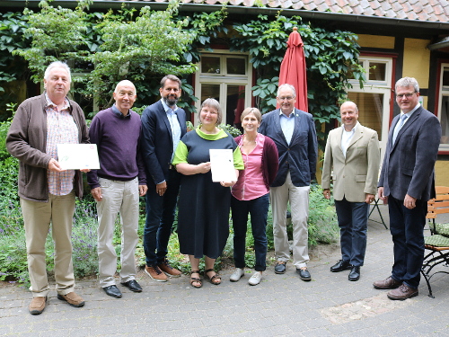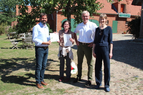 Umweltminister Olaf Lies (3. v.l.) überreicht den Förderbescheid an Vertreterinnen und Vertreter des BIO-Hotels Kenners LandLust im Beisein regionaler Akteure.