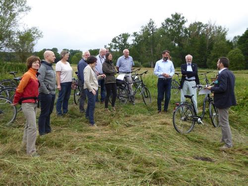 Im Anschluss fuhr Minister Lies in den Süden des Naturparks Elbhöhen-Wendland. Dort, in der Dumme-Niederung bei Bergen, wird derzeit vom NLWKN in Kooperation mit dem Bauernverband Nordost-Niedersachsen ein mehrjähriges Projekt zum Erhalt der wertvollen Kulturlandschaft umgesetzt, das auf die niedersächsische Förderrichtlinie „Landschaftspflege und Gebietsmanagement" zurückgeht. Mit dem Rad ging es durch die Wiesenlandschaft an der Dumme. Seit etwa 30 Jahren engagiert sich auch der BUND in der Landgraben-Dumme-Niederung. Die Niederungslandschaft mit ihren blütenreichen Feuchtwiesen steht beispielhaft für den Schutz von artenreichem Grünland und ist ein herausragender Lebensraum für unzählige Insektenarten oder geschützte Wiesenvogelarten. „Der BUND setzt sich seit Jahrzehnten für den Erhalt dieser wertvollen extensiv genutzten Wiesen und die Wiederherstellung naturnaher Gewässer direkt am Grünen Band Deutschland ein", sagt Axel Ebeler, stellvertretender BUND-Landesvorsitzender. „Vor dem Hintergrund des gravierenden Insektensterbens kommt dem Schutz und der Weiterentwicklung solcher Lebensräume eine erhebliche Bedeutung zu." Der Umweltverband arbeitet beim Schutzgebietsmanagement eng mit dem NLWKN zusammen. Für die Betreuung des Naturraums wurde im Jahr 2016 die Ökologische Station Landgraben-Dumme-Niederung des BUND eingerichtet. Die Arbeit der Ökologischen Station konzentriert sich auf die Entwicklung und den Schutz der Gewässer. Im Rahmen der Sommerbereisung wurden erfolgreich abgeschlossene und geplante Projekte zur Fließgewässerentwicklung an der Dumme besichtigt.