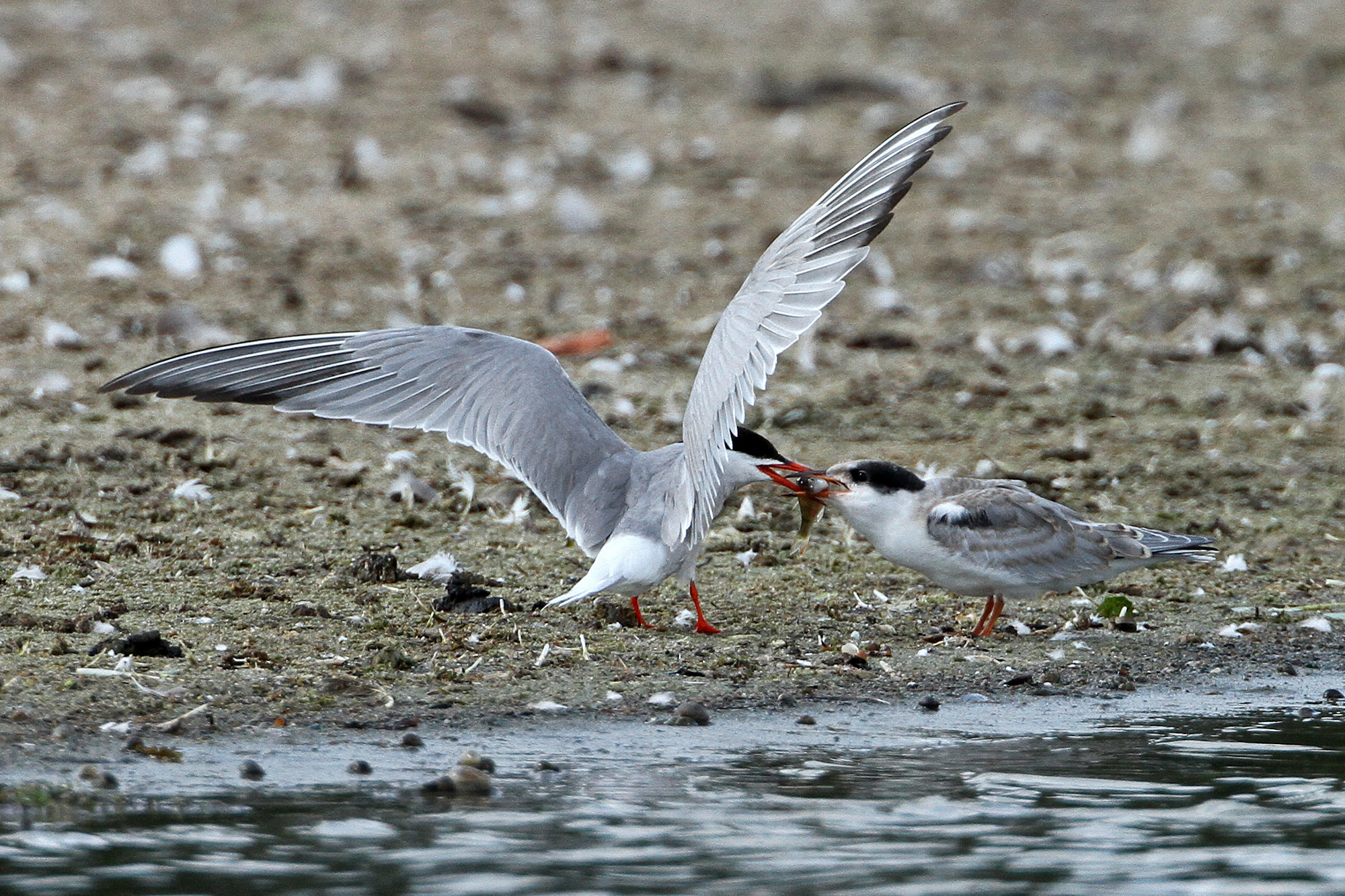 Flussseeschwalbe bei der Fütterung eines Jungvogels.