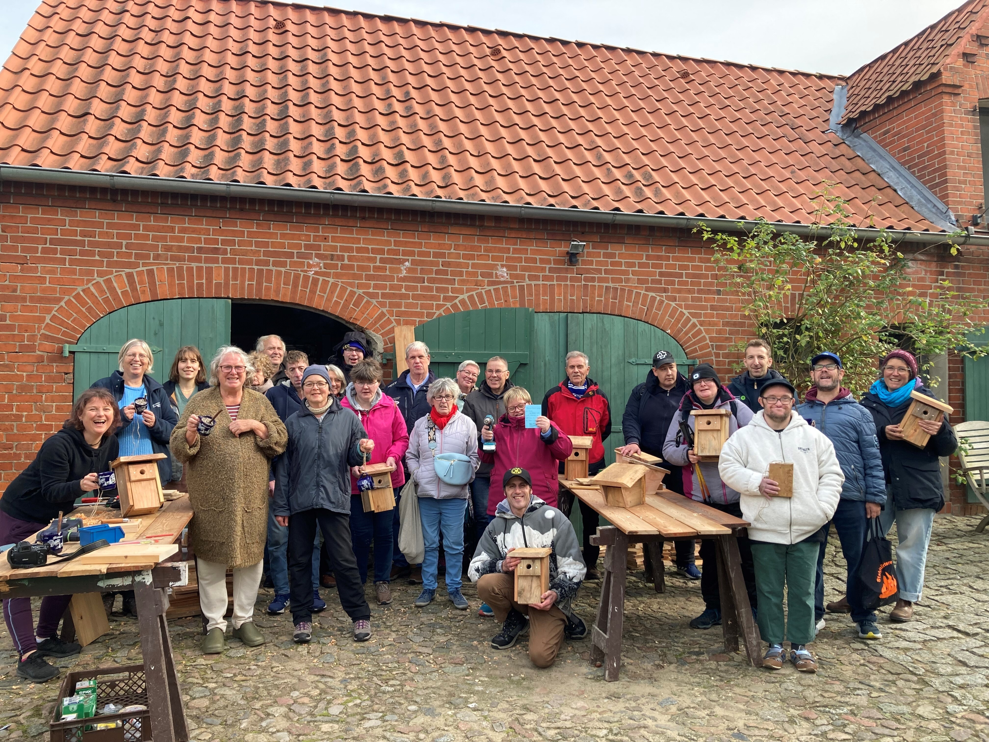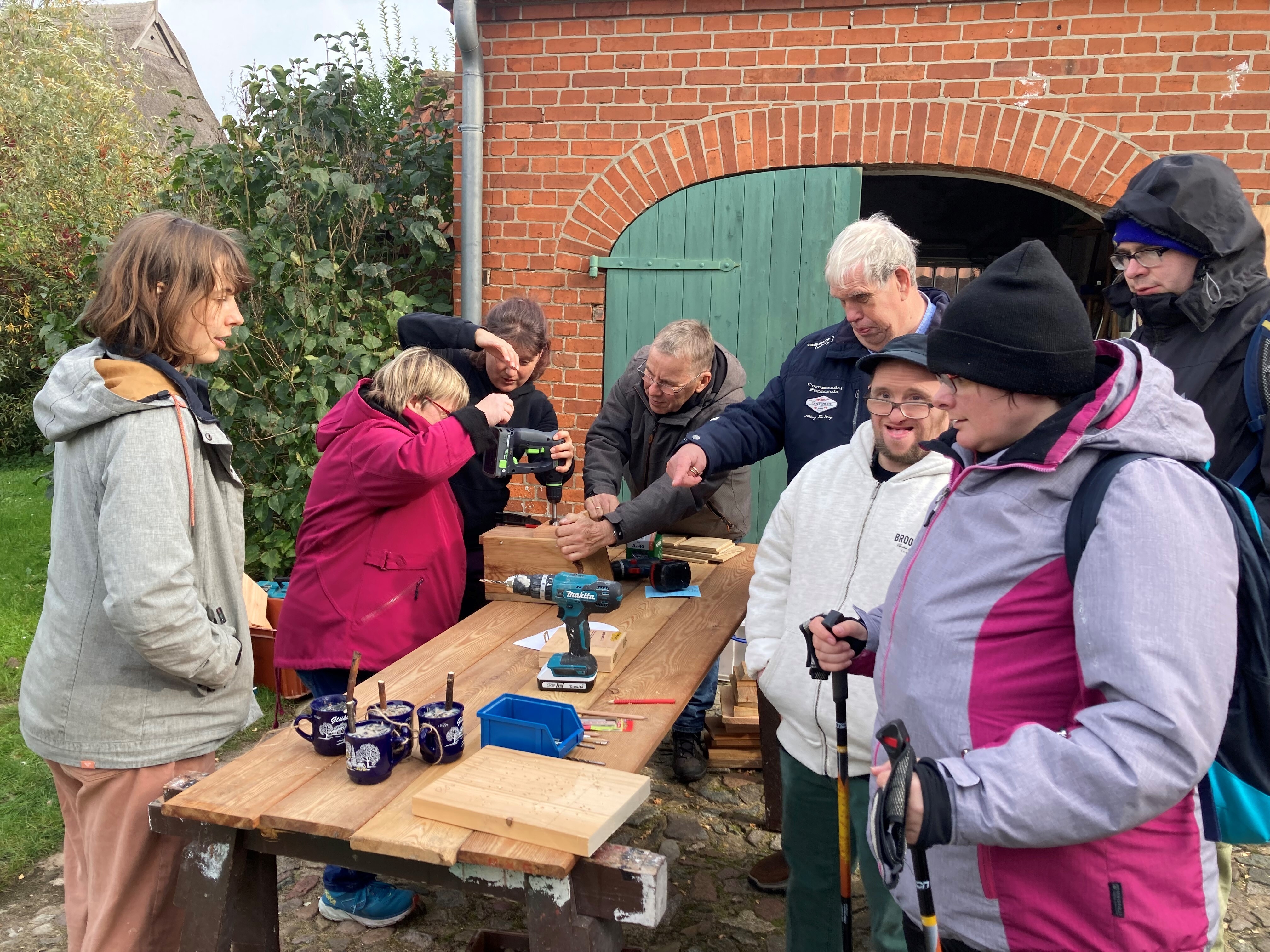 Eingemummelt in dicke Jacken erreichten rund 20 hochmotivierte Teilnehmende mit und ohne Behinderungen der Lebenshilfe Lüneburg-Harburg gGmbH am Samstagmorgen den Hof Konau 11 in der Gemeinde Amt Neuhaus. Bei Temperaturen von nur wenigen Grad über dem Gefrierpunkt freuten sie sich darauf, wieder für die Natur aktiv werden zu können und sich für den Erhalt der Artenvielfalt einzusetzen. Diesmal ging es darum, Nistkästen für Höhlen- und Halbhöhlenbrüter zu bauen sowie Überwinterungshilfen für verschiedene Insekten und Winterfutter für Vögel herzustellen.