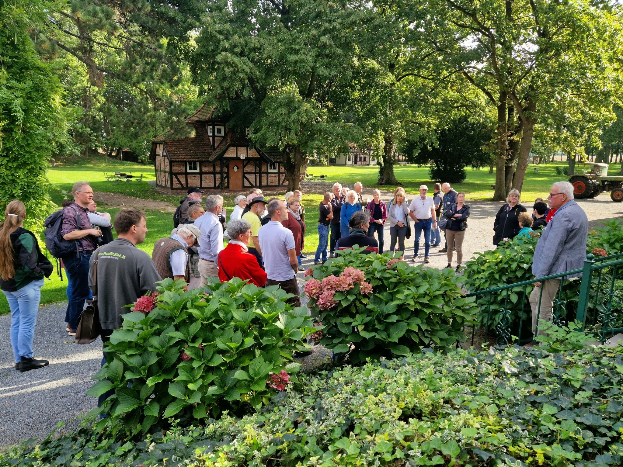 Den Anfang machte das vom Ehepaar Prüfert betriebene Gutshaus Büttnershof in Iden. Herr Prüfert nahm die Teilnehmenden mit auf eine Zeitreise durch die Geschichte des Ensembles vom einstigen Adelssitz bis zum heutigen Hotel und Restaurant mit seinen weitläufigen Parkanlagen, in denen zahlreiche Veranstaltungen angeboten werden.