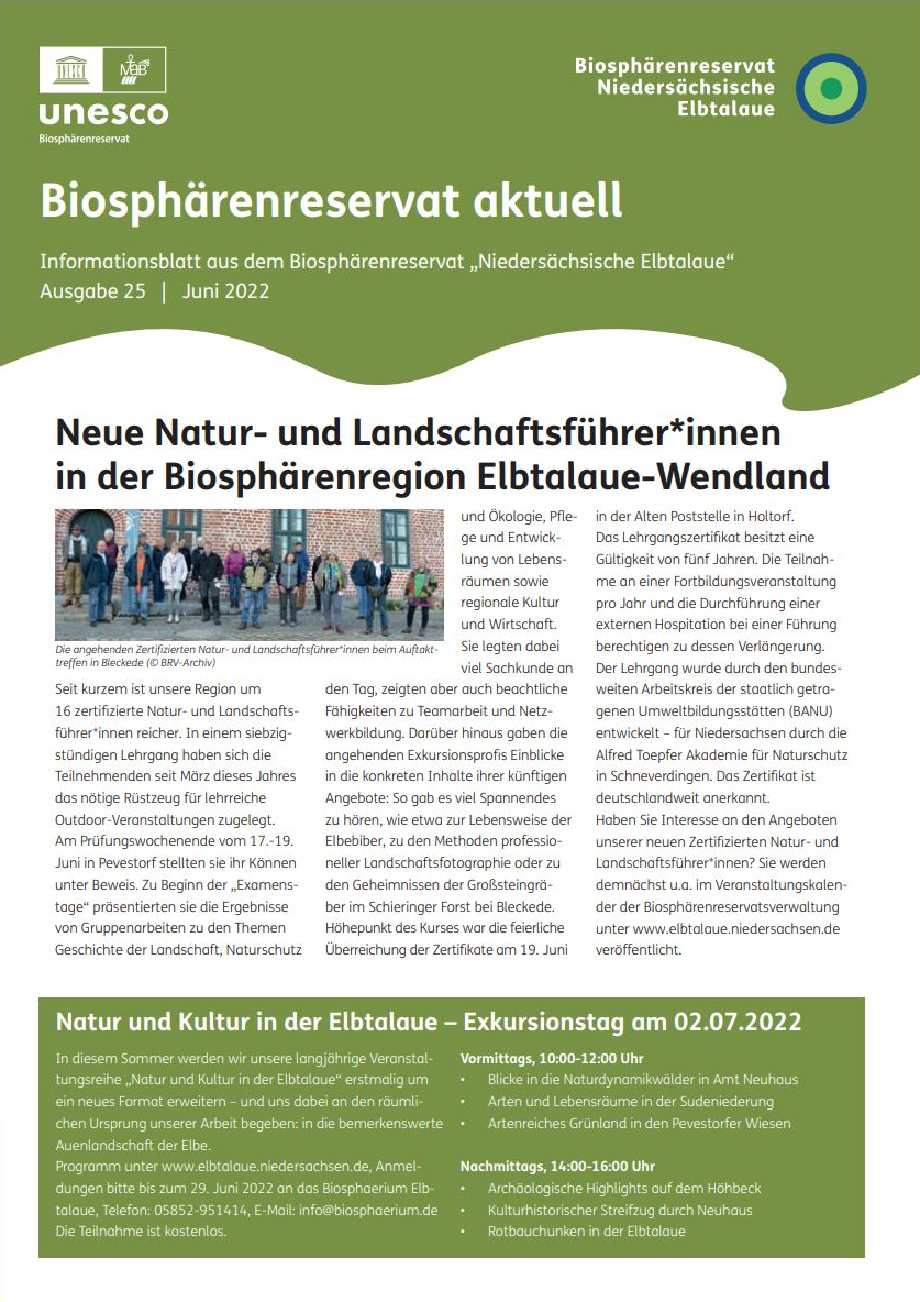 In der neuesten Ausgabe unseres Newsletters wird, erstmals im neuen Layout der Nationalen Naturlandschaften, von der erfolgreichen Zertifizierung 16 neuer Natur- und Landschaftsführer*innen berichtet. Ferner wird der neu entwickelte „Biosphärenraum“ des Biosphaeriums in Bleckede kurz vorgestellt.