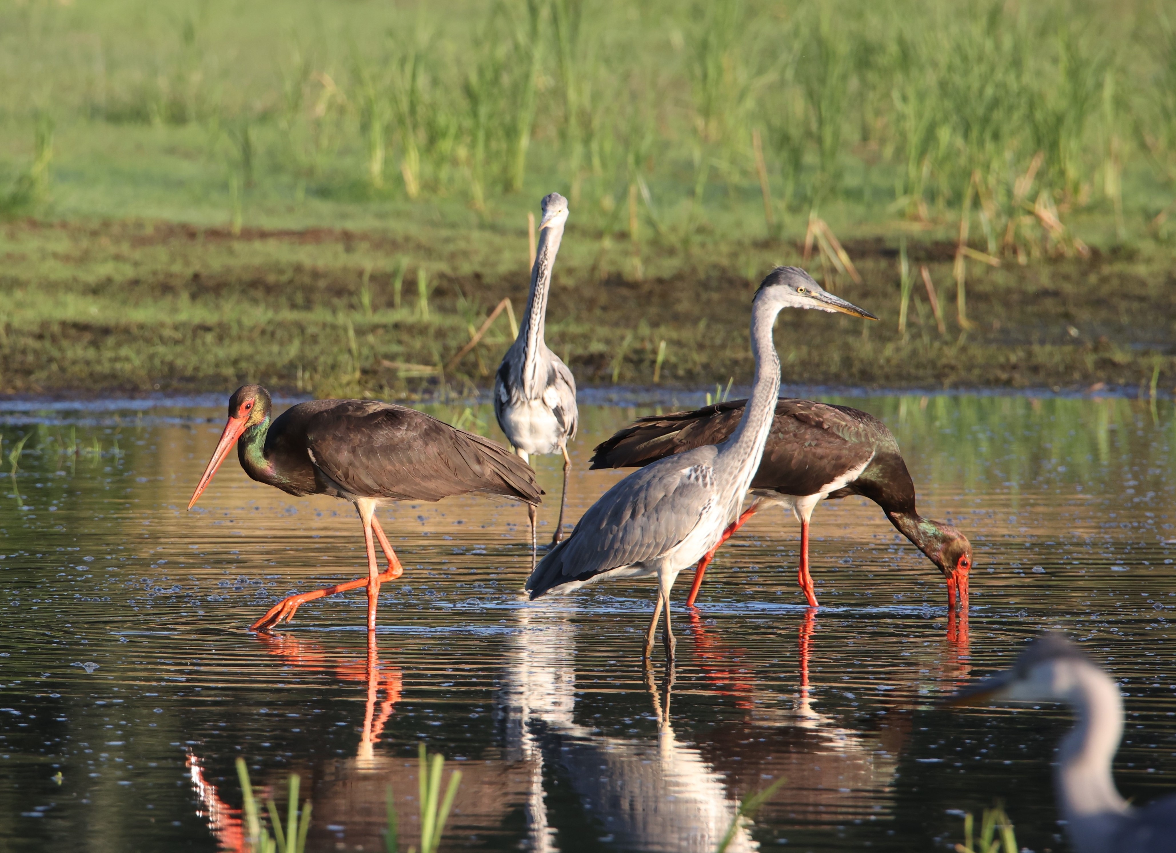 Schwarzstörche und Graureiher bei der Nahrungsaufnahme