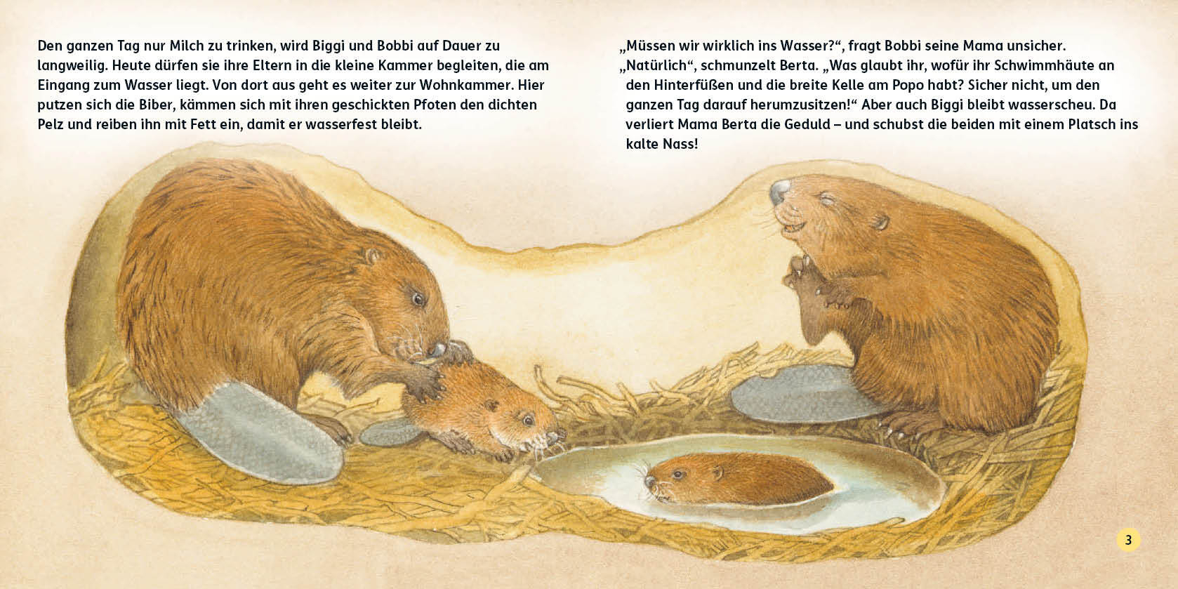 „Biggi und Bobbi sind der ganze Stolz ihrer Eltern: Sie sind die ersten Kinder, die Mama Berta zur Welt bringt. Doch so kuschelig es in ihrer Biberburg ist, Faulenzen ist nicht gerade das, was einem echten Biber Spaß macht. Gemeinsam mit ihren Eltern rüsten sich die Kleinen gegen ungebetene Gäste und packen tatkräftig mit an: Einmal droht ihr Zuhause auszutrocknen, ein anderes Mal scheint es in den Regenmassen unterzugehen … und was nur können sie tun, damit sie im Winter nicht hungern müssen?“Der Biber bewohnte einst die gesamte Laub- und Nadelwaldzone Europas und Asiens. Nach jahrzehntelanger Verfolgung war er fast ausgestorben, hat jedoch im Urstromtal der Elbe überlebt. Heute erobert er sich wieder seine angestammten Lebensräume in Deutschland zurück. Das ist gut so, denn der geniale Holzfäller, Baumeister und Landschaftsgestalter kann angesichts des Klimawandels zu einem wichtigen Helfer werden, um Wasser in der Landschaft zu halten.