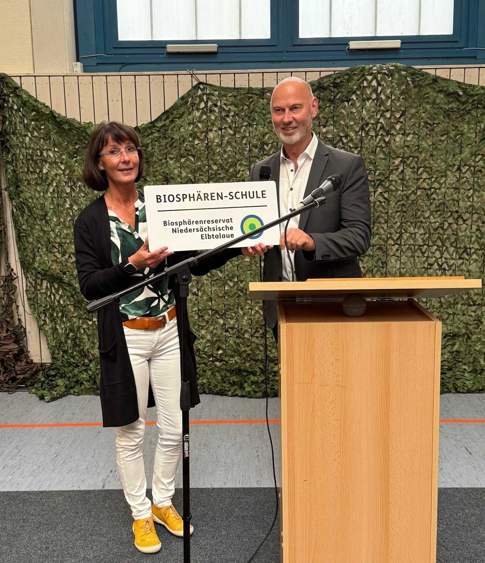 Dirk Janzen, Leiter der Biosphärenreservatsverwaltung, übergibt Diana Ullrich, Schulleiterin, das Schild zur Auszeichnung als Biosphären-Schule.