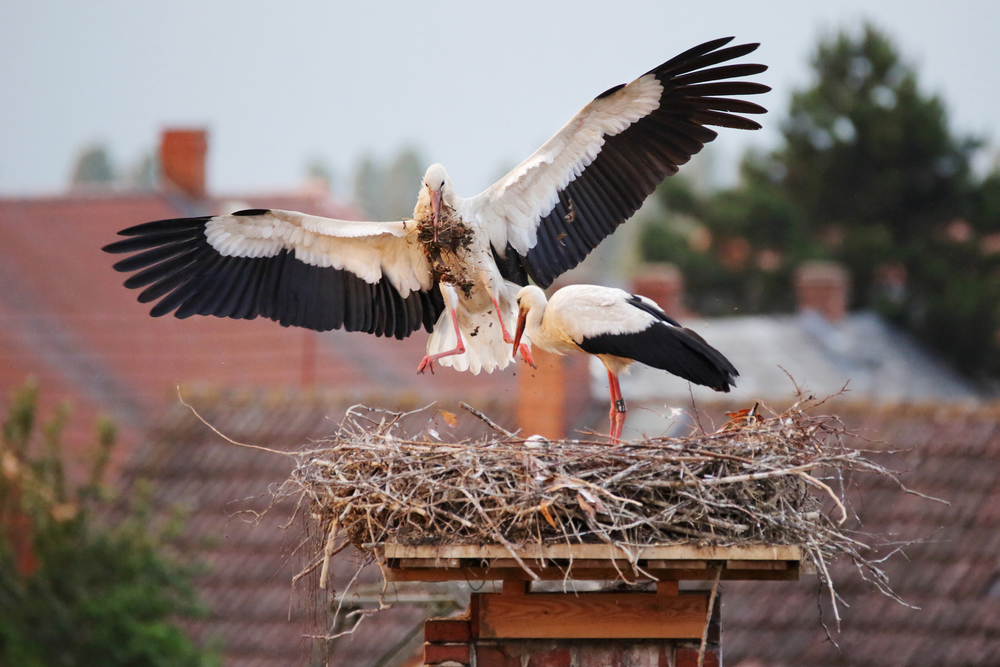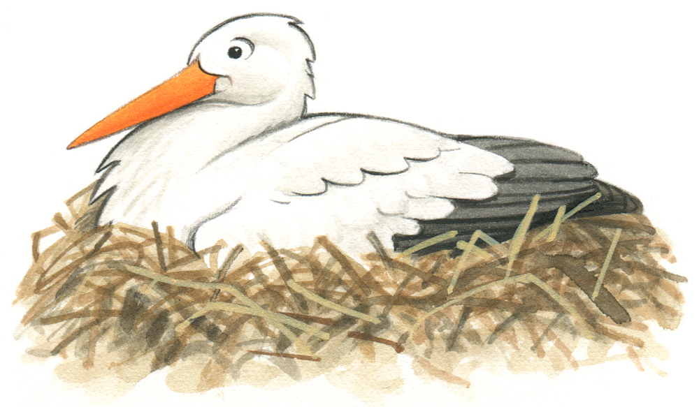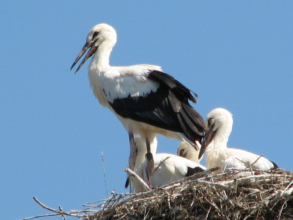Ab April beginnen die Störche zu brüten, meist 2 bis 6 Eier pro Nest. Dieses Nest wurde vorher behutsam von dem Storchenpaar aus Federn und Zweigen zusammengebaut. Wo die Eltern das Nest, auch „Horst“ genannt, bauen ist unterschiedlich. Manchmal entscheiden sie sich, es auf einem Strommast zu bauen. Andere Storchenpaare bauen ihres auf Bäumen oder sogar Gebäuden. Nachdem es sich einmal für einen Nistplatz entschieden hat, bleibt ein Storchenpaar seinem Horst meist über mehrere Jahre treu. Das Ausbrüten der Storchenküken ist dabei Teamarbeit. Beide Elternteile brüten abwechselnd die Eier aus, bis nach 30 Tagen im Durchschnitt etwa 2 bis 3 Küken schlüpfen.