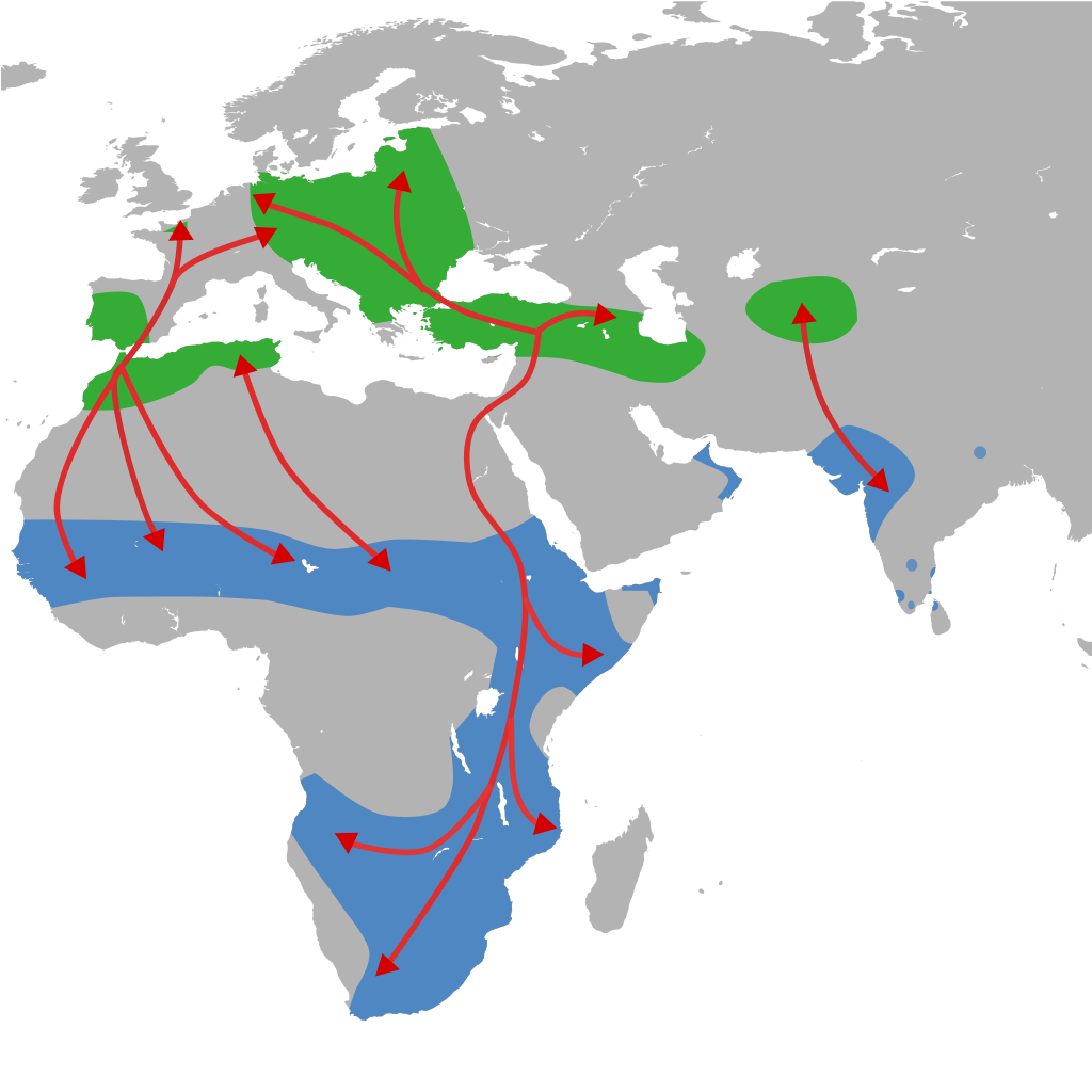 Verbreitung und Zugwege des Weißstorchs (grüne Markierung: Sommer, blaue Markierung: Winter) (Quelle: Von Shyamal - Eigenes Werk, CC0, https://commons.wikimedia.org/w/index.php?curid=12209467)