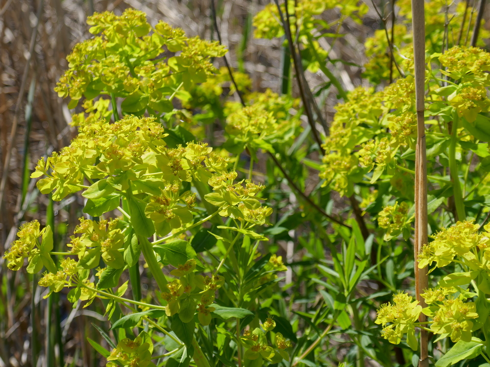 Zu ihnen gehört etwa die Sumpf-Wolfsmilch. Diese kräftige, bis zu 1,50 m hohe uferbegleitende Staude, ist im Mai und Juni gut durch ihre Größe und die leuchtend grünlich-gelben Blütenstände zu erkennen, die später grüne, warzige Früchte tragen. Auch im Winter fällt sie als imposanter, abgeblühter Busch mit trockenen, verholzten Trieben ins Auge. Bei Verletzungen sondert sie weißen Milchsaft ab. Diese Stromtalpflanze steht auf der Roten Liste der gefährdeten Pflanzenarten in Deutschland und Niedersachsen.