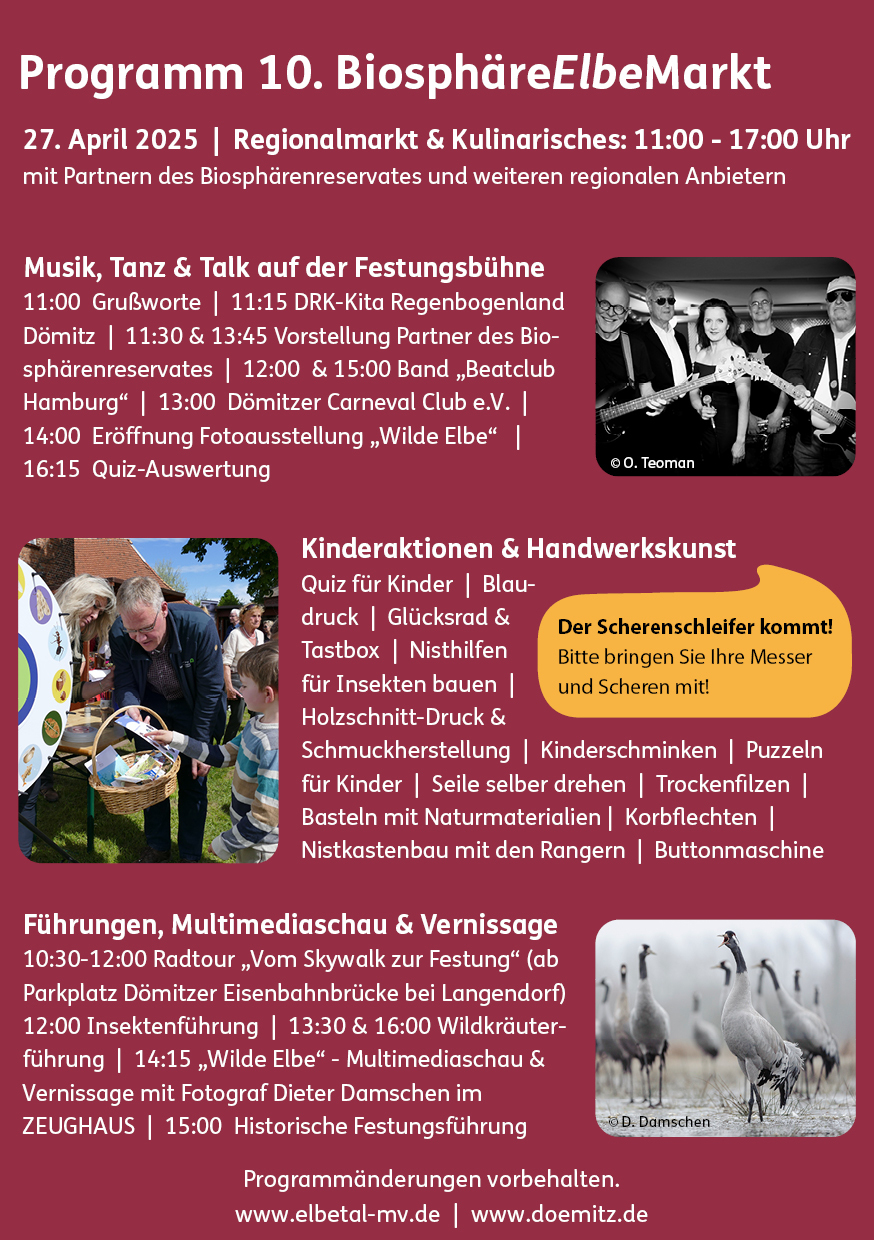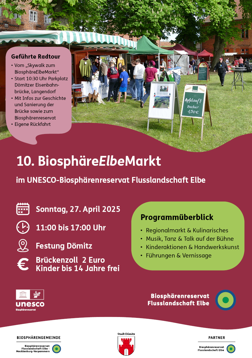 Bereits zum 10. länderübergreifenden BiophäreElbeMarkt laden die Stadt Dömitz und das Biosphärenreservatsamt Schaalsee-Elbe am Sonntag, 27. April 2025, von 11.00 bis 17.00 Uhr auf die Festung Dömitz ein.