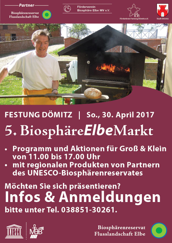 Am Sonntag, 30. April 2017, laden die Stadt Dömitz und das Biosphärenreservatsamt Schaalsee-Elbe von 11.00 bis 17.00 Uhr zum „5. BiosphäreElbeMarkt - im Frühling“ auf die Festung Dömitz ein. Der Eintritt auf den Festungshof ist zu diesem Anlass kostenfrei. Für die großen und kleinen Festungsbesucher wird ein abwechslungsreiches Programm auf die Beine gestellt.