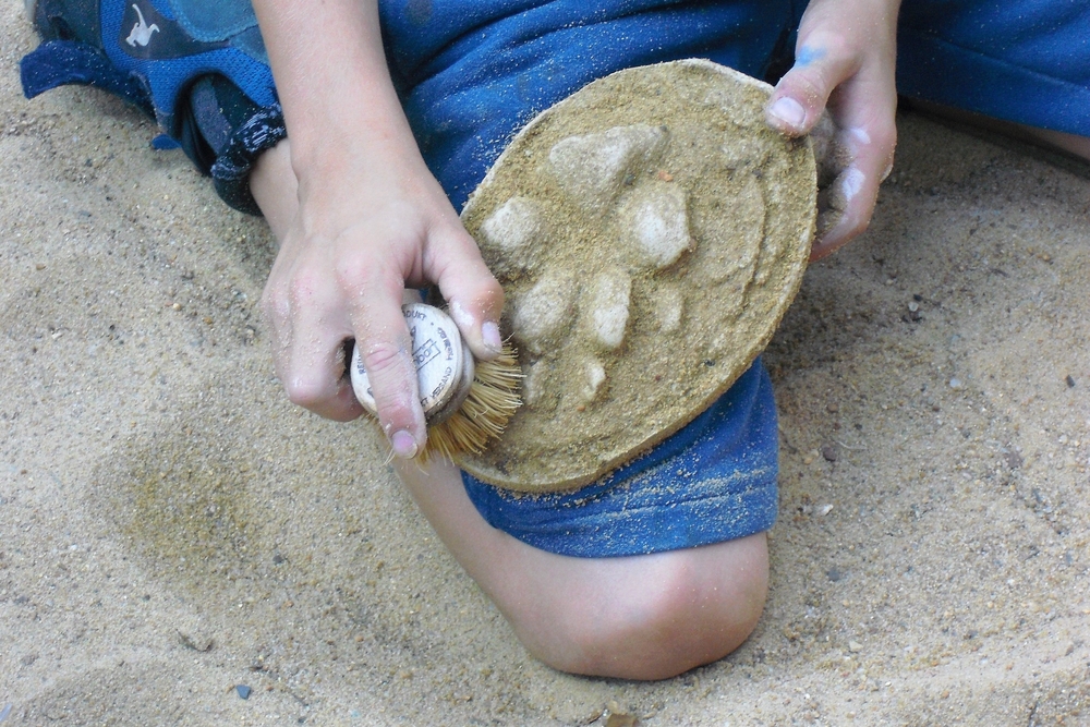 Tiere hinterlassen erstaunlich viel: Federn, Fell, Fraßspuren, Kot und auch Fußspuren. Die Trittspuren können mit Gips ausgegossen werden. Sind sie erst einmal hart, können sie gereinigt werden und sind dann deutlich erkennbar. Alle Spurensuchenden können sich eine Trittspur gießen, vom Wildschwein, Reh, Fuchs und vielen anderen Tieren. Die fertigen Gipsabdrücke werden als besondere Erinnerung, mit nach Hause genommen.